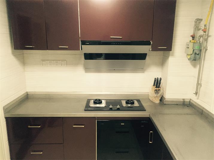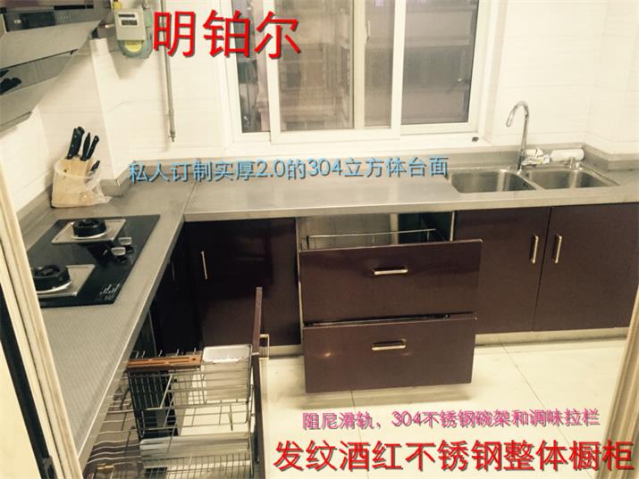 此套酒紅不銹鋼整體櫥柜,臺面板采用實厚2毫米304材質。可以使用100年的不銹鋼整體櫥柜。